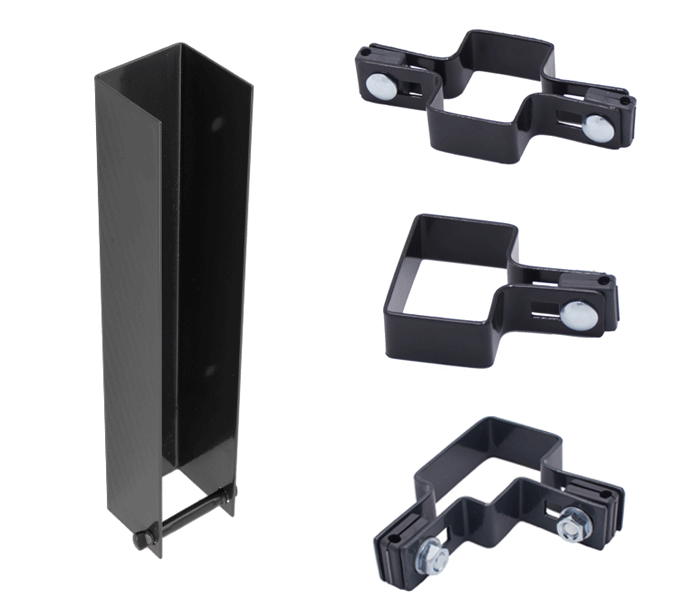 • Obejmy montażowe – stosowane do mocowania paneli ogrodzeniowych do słupków. Dostępne są w różnych wariantach (startowe, uniwersalne, narożne, przelotowe), co pozwala na dopasowanie ich do każdego rodzaju ogrodzenia panelowego. Wykonane ze stali i zabezpieczone antykorozyjnie, gwarantują stabilność oraz estetyczny wygląd konstrukcji.